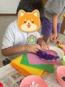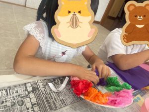 まず始めに好きな色のお花紙を選んで、くしゅくしゅと丸めて紙皿に貼っていきました。