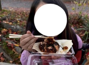 お城の下のベンチでは、みんなでたこ焼きを囲んでほっと一息🐙