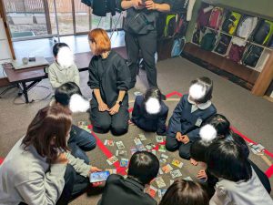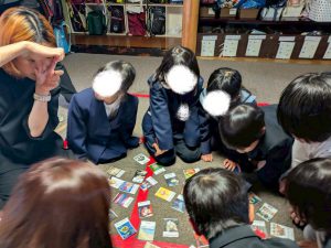 みんなで円を作ってもらいその曲にあったカルタを探して