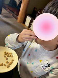 節分の日なのでおやつの時間にまめをみんなで食べました( *´艸`)豆が苦手と言った子どもたちはも一口食べたら「おしいし」とおかわりをしてました🌟(^O^)/
