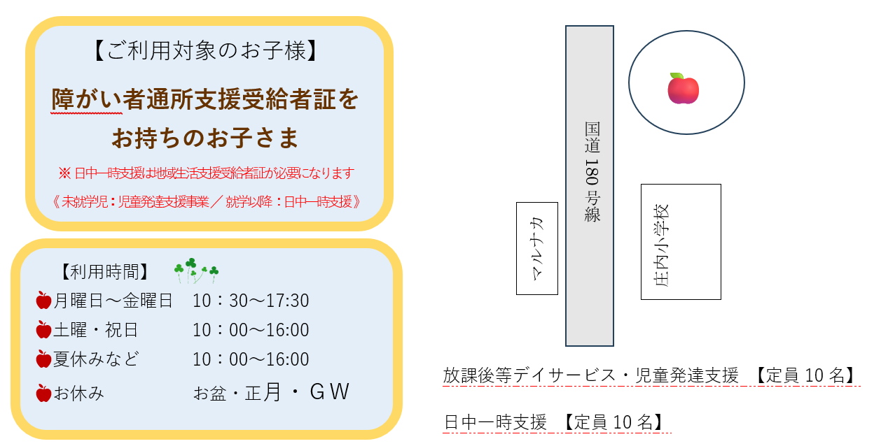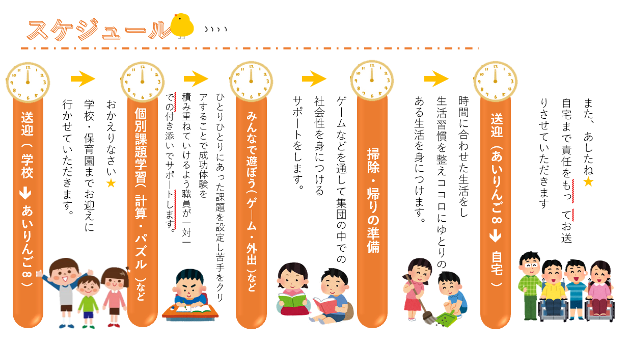 あいりんご8に来てくださるお子さまに楽しい!!行きたい!!と思っていただけるそしてそのご家族様がお子さまを安心して預けることのできるデイサービスを目指しています。 子どもたちは早い時期から沢山の経験や体験をすることで様々な力を身につけ成長し自立していきます。 あいりんご8ではそんな子ども達と一緒に石垣を積み上げる様に一歩ずつ成功体験を重ねていく為のお手伝いをさせていただきます。
